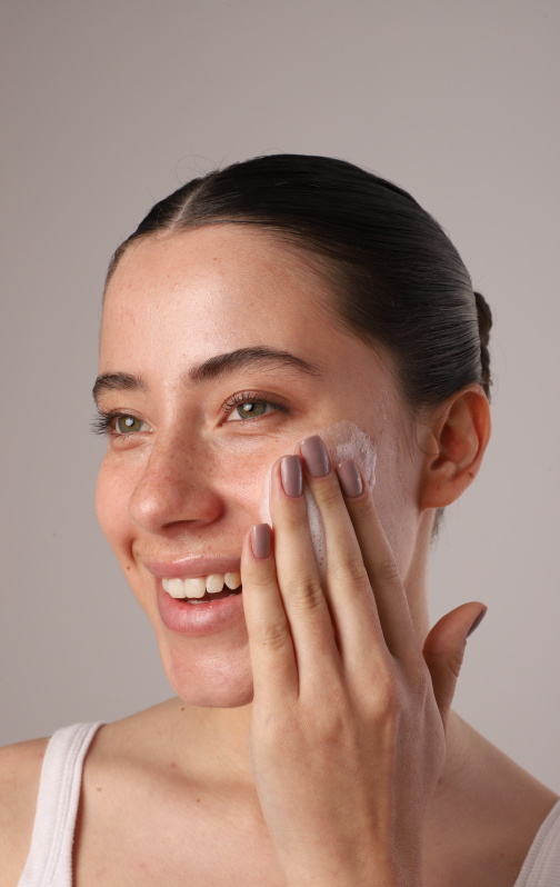 Apliqueuma pequena quantidade nas mãos e espalhe sobre o rosto molhado, massageando suavemente.